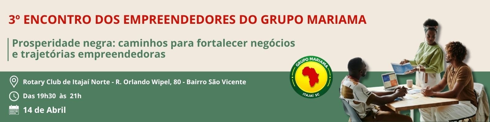 O Grupo Mariama convida você para o 3º Encontro de Empreendedores, um espaço de escuta, troca e fortalecimento voltado à comunidade empreendedora negra de Itajaí.