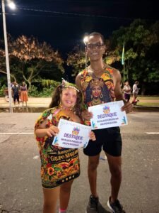 Entre tantos foliões animados, dois nomes se destacaram e foram eleitos os grandes destaques do bloco: Helton e Beatriz, que levaram premiação especial oferecida pelo Restaurante Schroeder. Uma homenagem merecida a quem representou com brilho o espírito do Grupo Mariama na avenida.